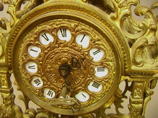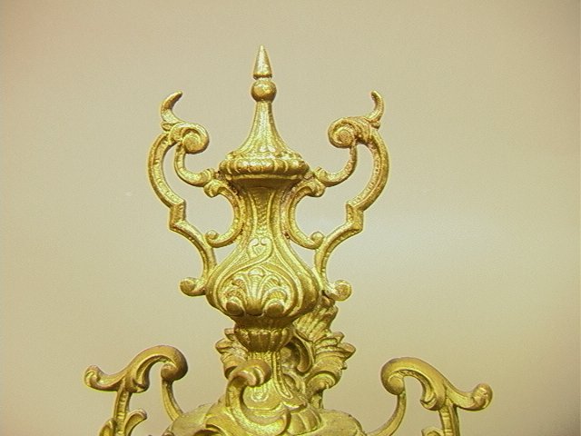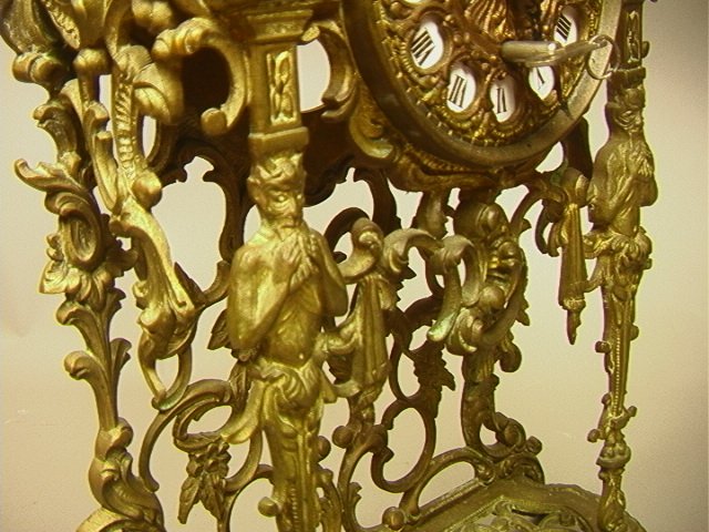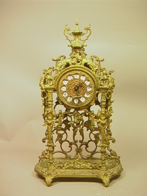 Decorative Brass Figural Shelf Clock. Base marked Made in Spain Dimensions: H: 20 inches: W: 12 inches: D: 6 inches