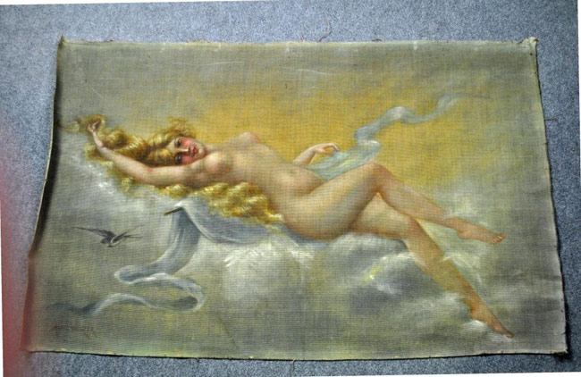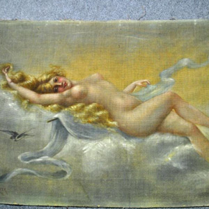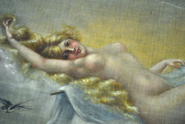 depicting a reclining nude with blue bird in flight