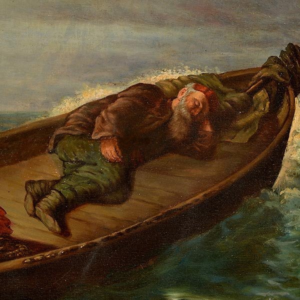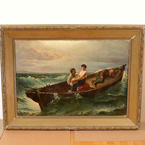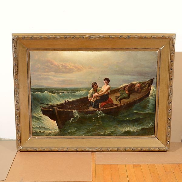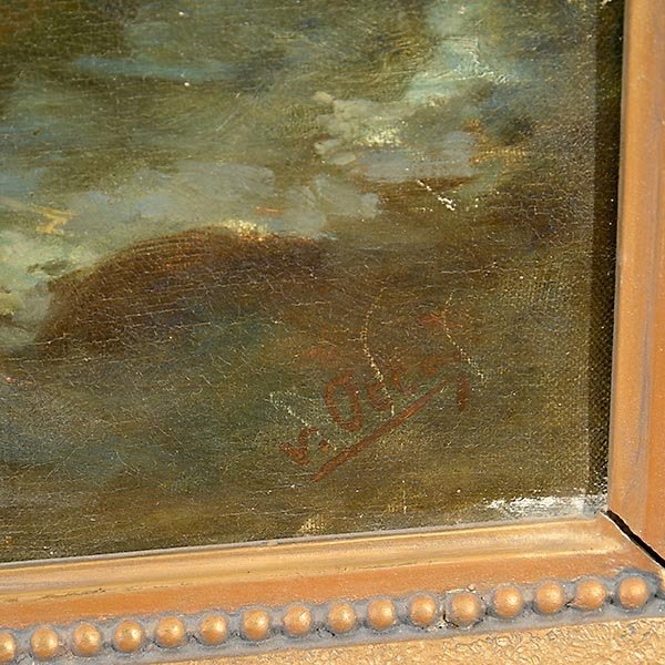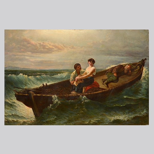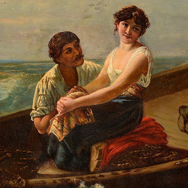 Lovers in a Boat Oil on canvas. 28 X 40 inches. Signed lower right "V Otto". Verso: Stamp "Otto Ebelling".