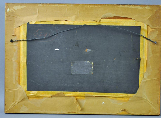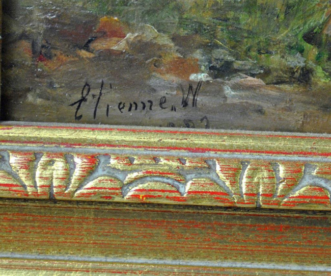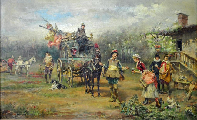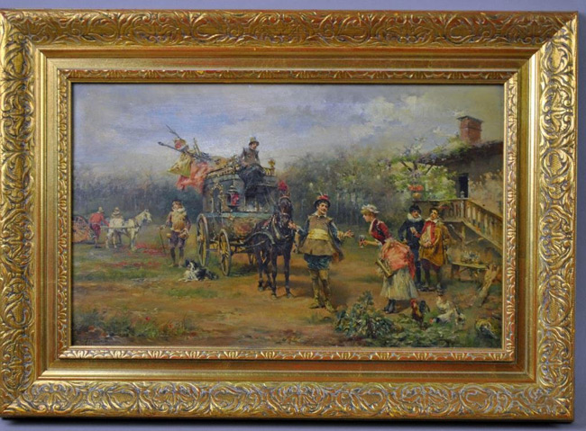 genre scene depicting a well appointed horse and carriage, figures, chickens and a dog, signed lower left, 11x18in.
