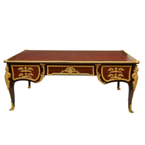 French bureau plat with figural doré bronze mountings, 19th c, a partners desk having large leather top with ormolu perimeter, set over five frieze drawers on two sides, cabriole legs terminate in claw feet, "France" stenciled on underside of top, spurious mark of Paul Sormani at lock plates, restorations, 32"h, 77.25"w, 43.5"d