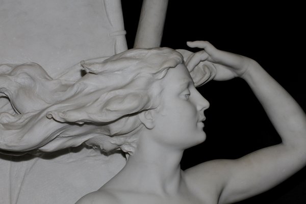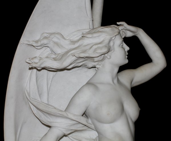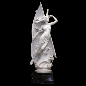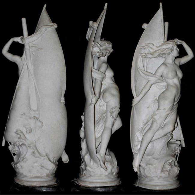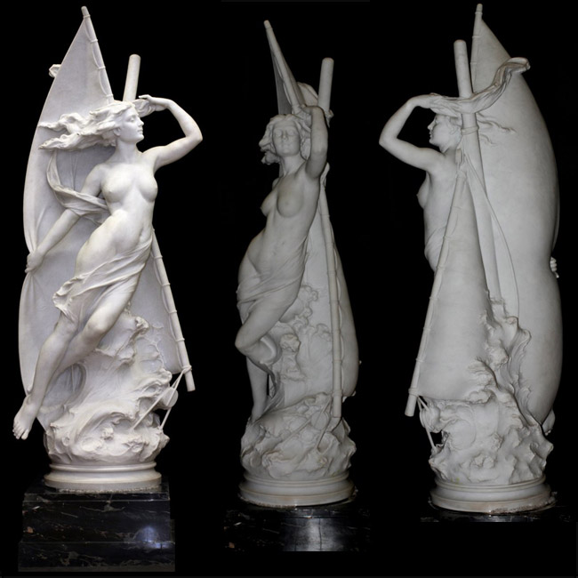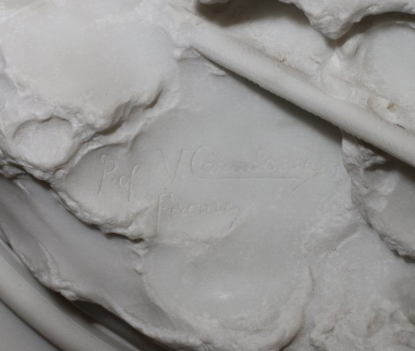 说明:Carved Carrara marble group of a nereid, or sea nymph, sensuously wrapped in the sail of a vessel. Signed "Prof. V. Caradossi Firenze". On a black marble base.