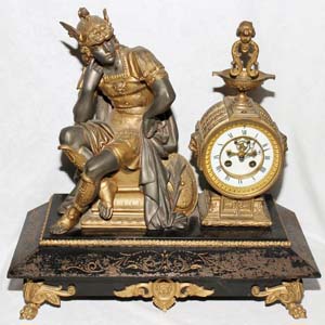 H 18", W 19": Spelter case with figure of seated Mercury wearing gilded armor. #13852 Property of Gloria Bradley trust.