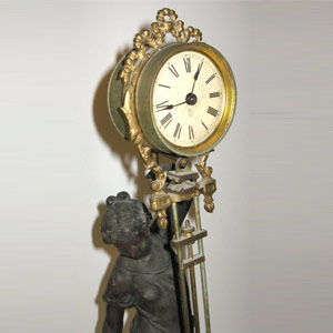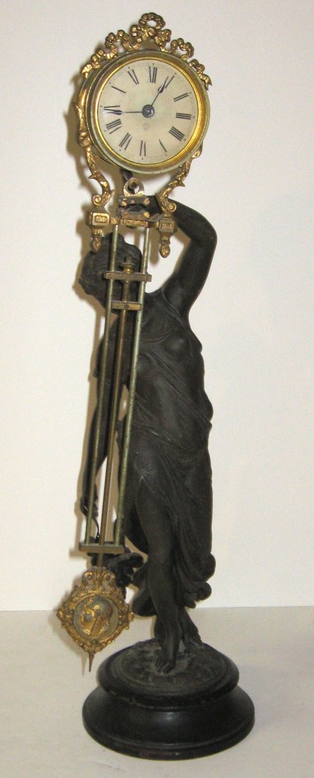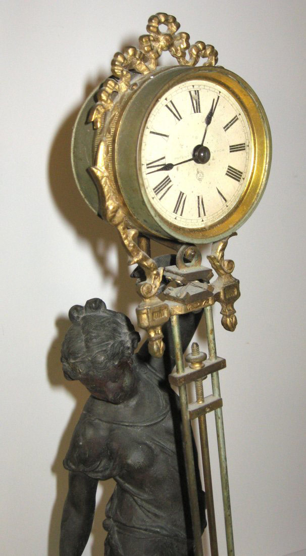 figural bronze swing arm clock, 3" dial, 25" ht, circa 1906