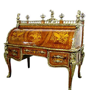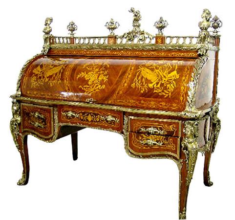 French Louis XV desk. With heavy gilding, brass ormolu trim, intricate marquetry work, and bombay sides. Dimensions: 59"W x 57"H x 39"D.