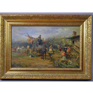 genre scene depicting a well appointed horse and carriage, figures, chickens and a dog,